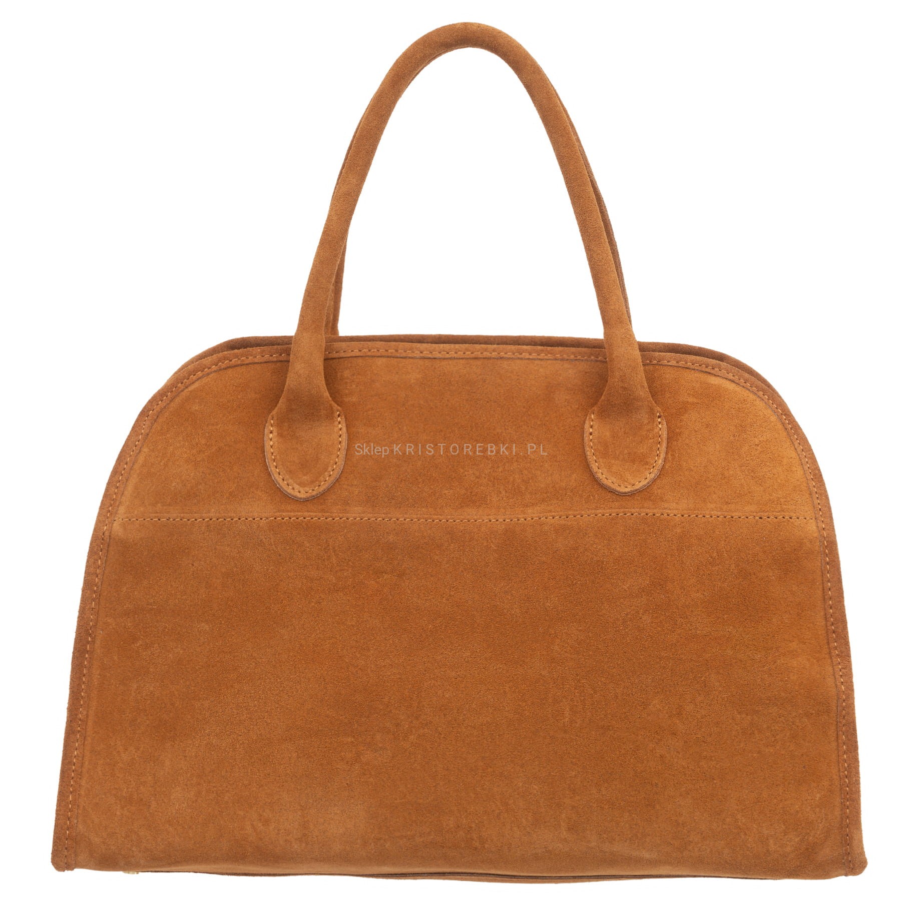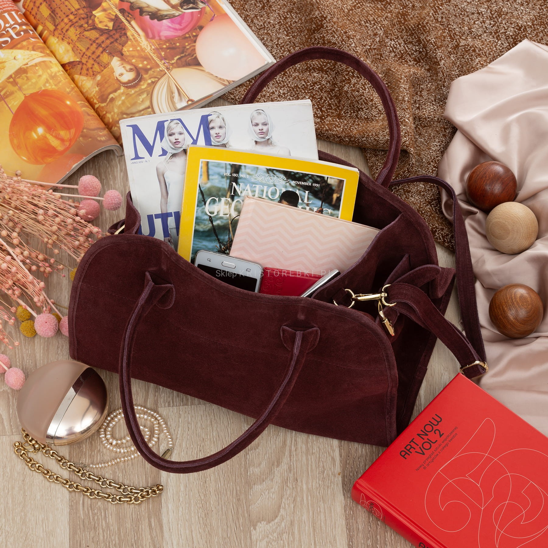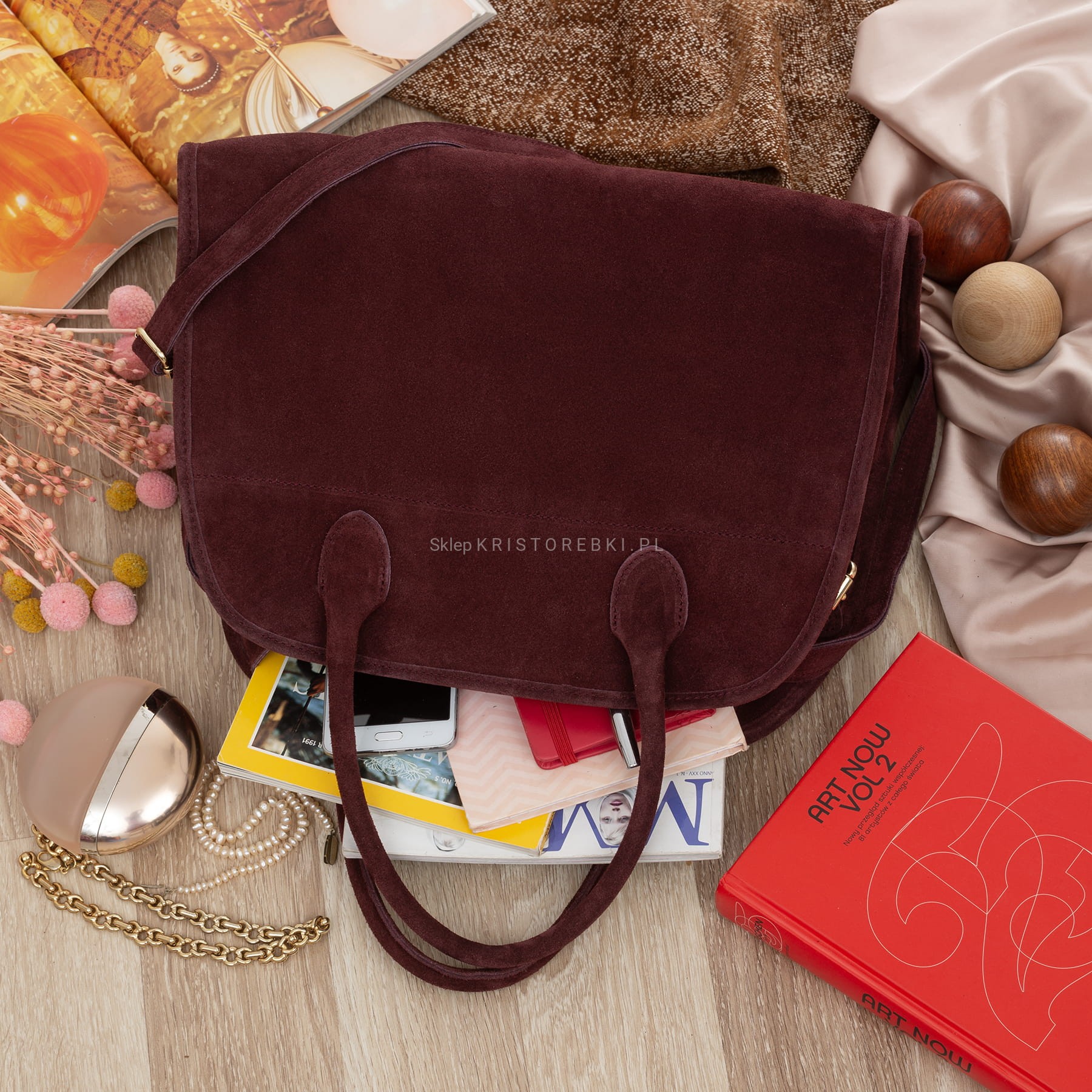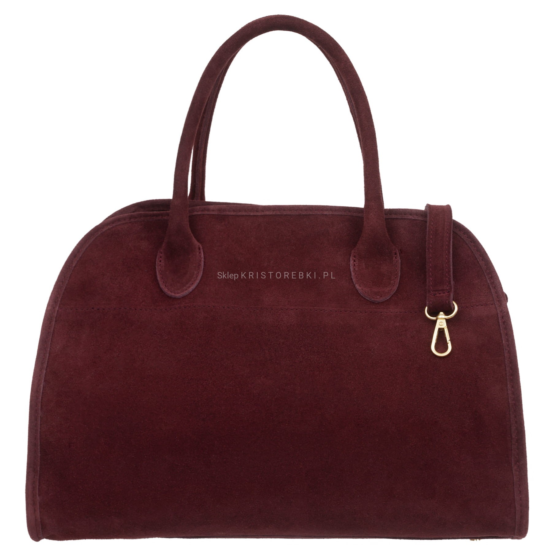 VERA PELLE torebka damska zamszowa klasyczna duża z paskiem na ramię V675 ciemna bordowa
