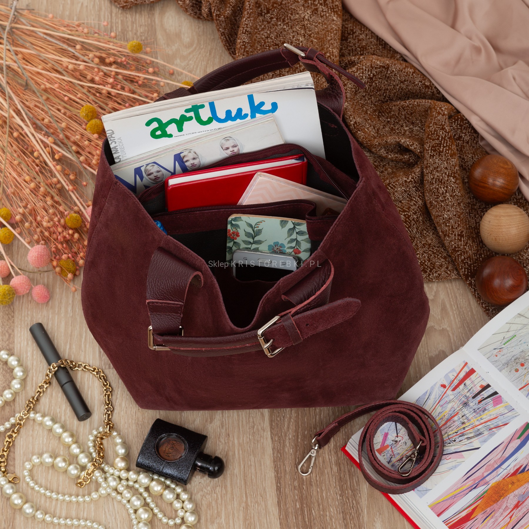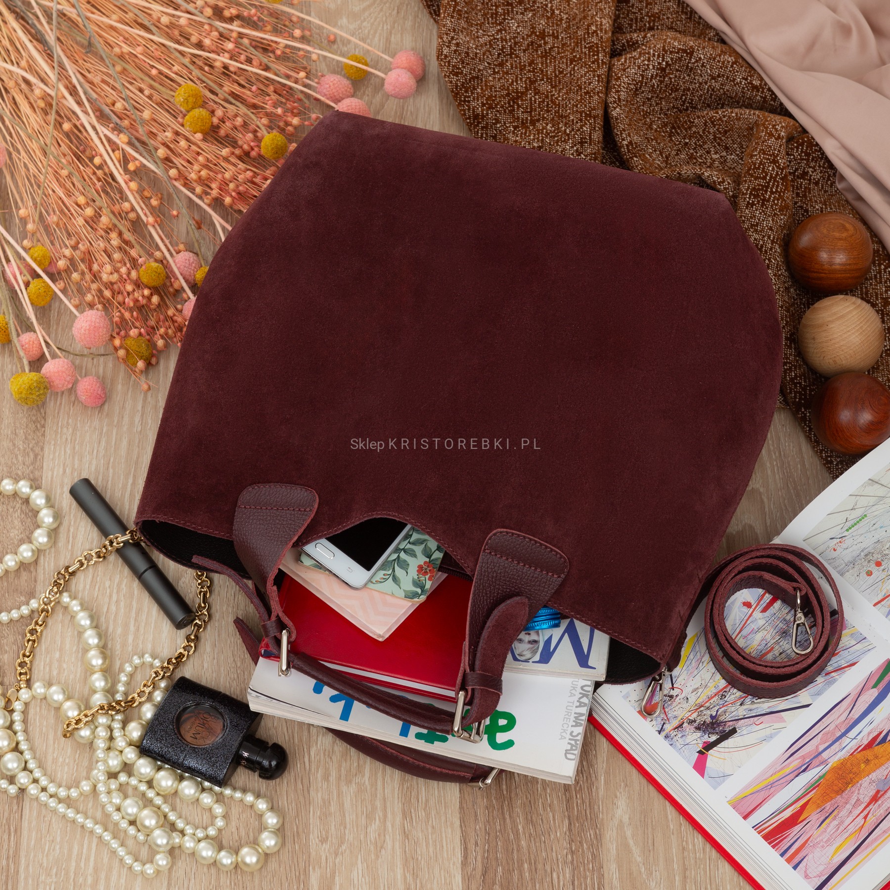 VERA PELLE torebka damska zamszowa shopper duża z paskiem na ramię V680 ciemna bordowa
