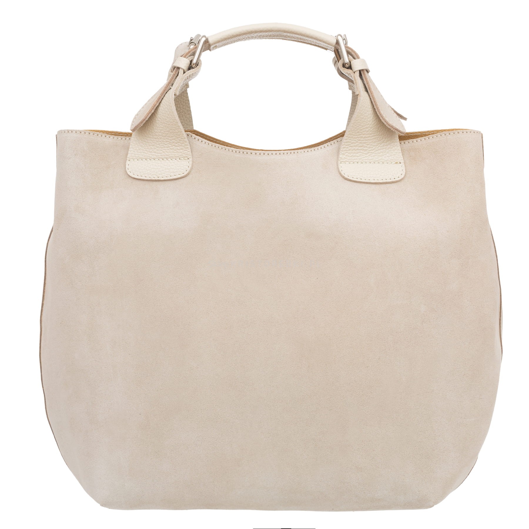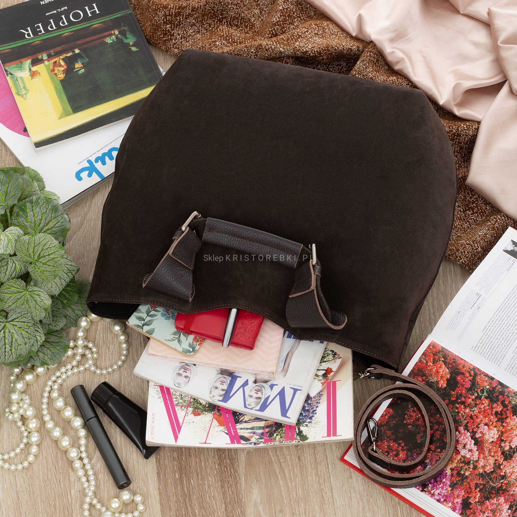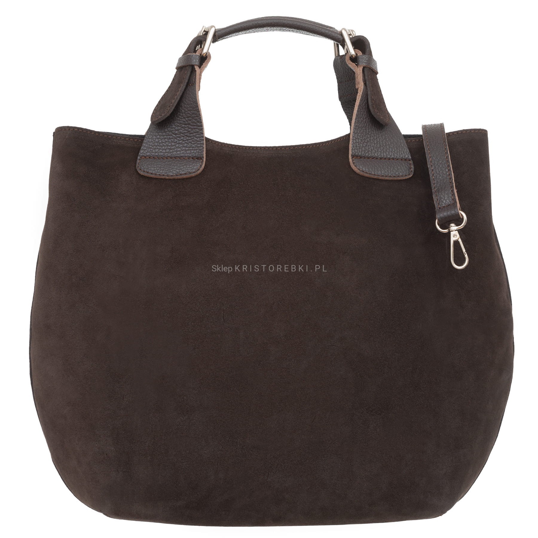 VERA PELLE torebka damska zamszowa shopper duża z paskiem na ramię V680 ciemna brązowa