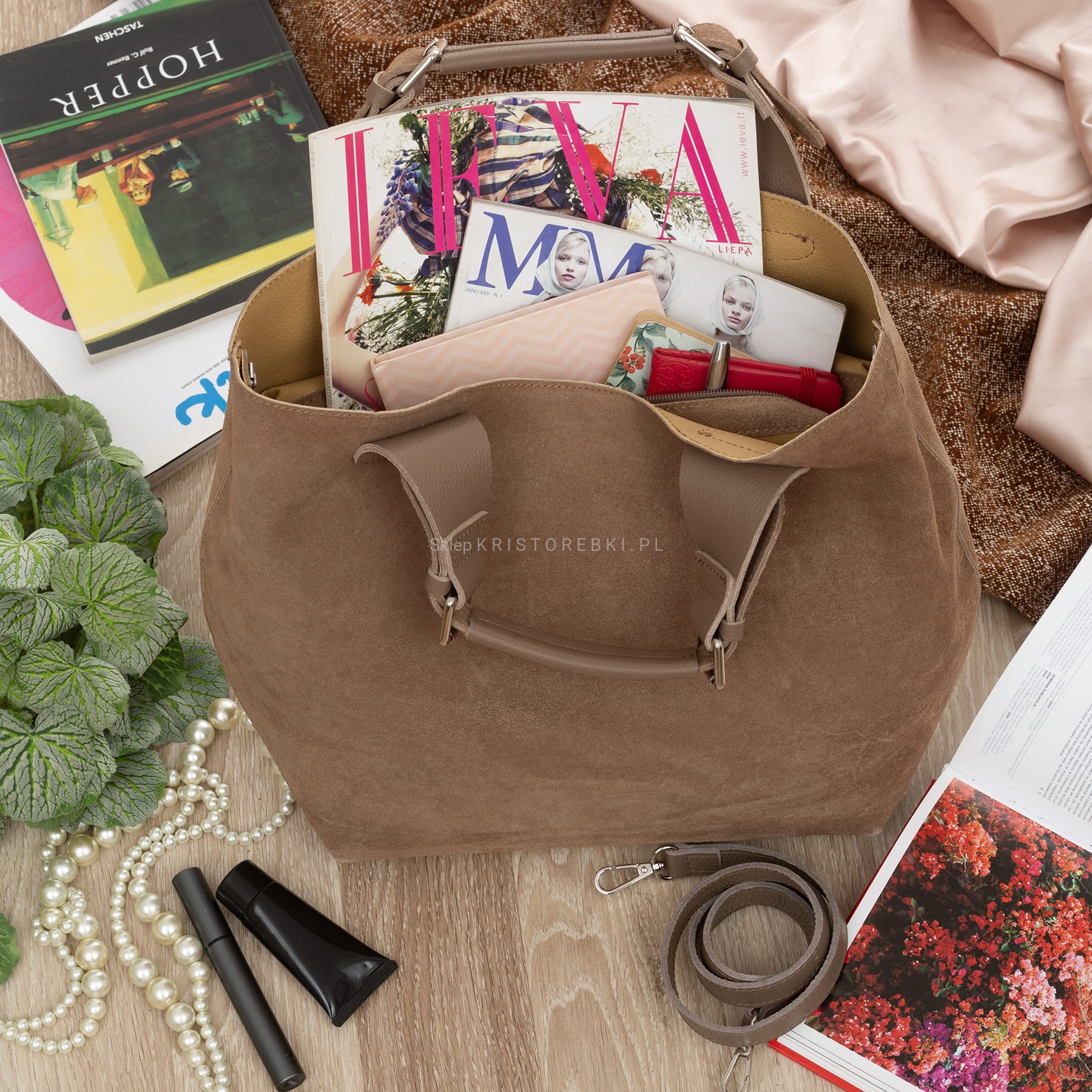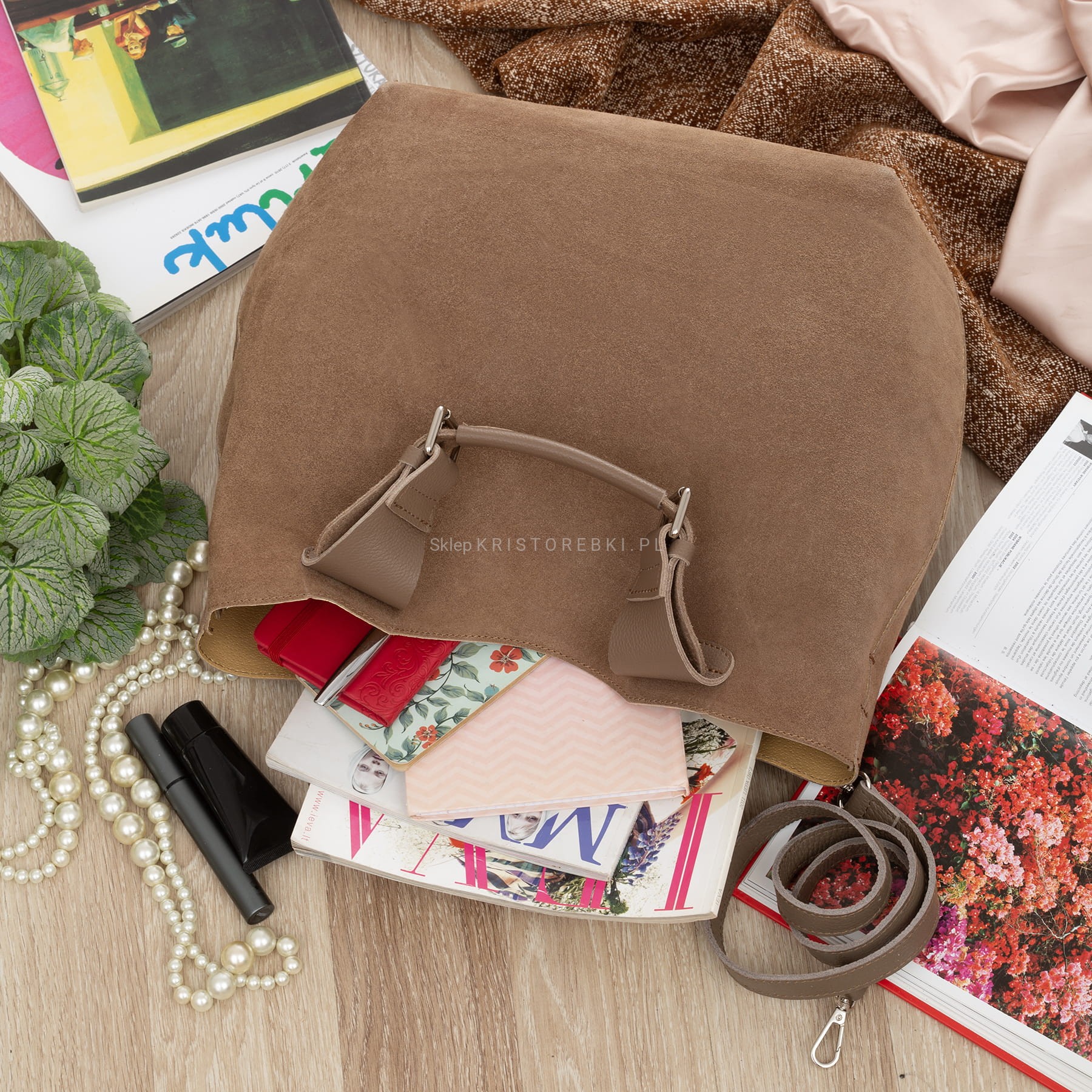 VERA PELLE torebka damska zamszowa shopper duża z paskiem na ramię V680 taupe