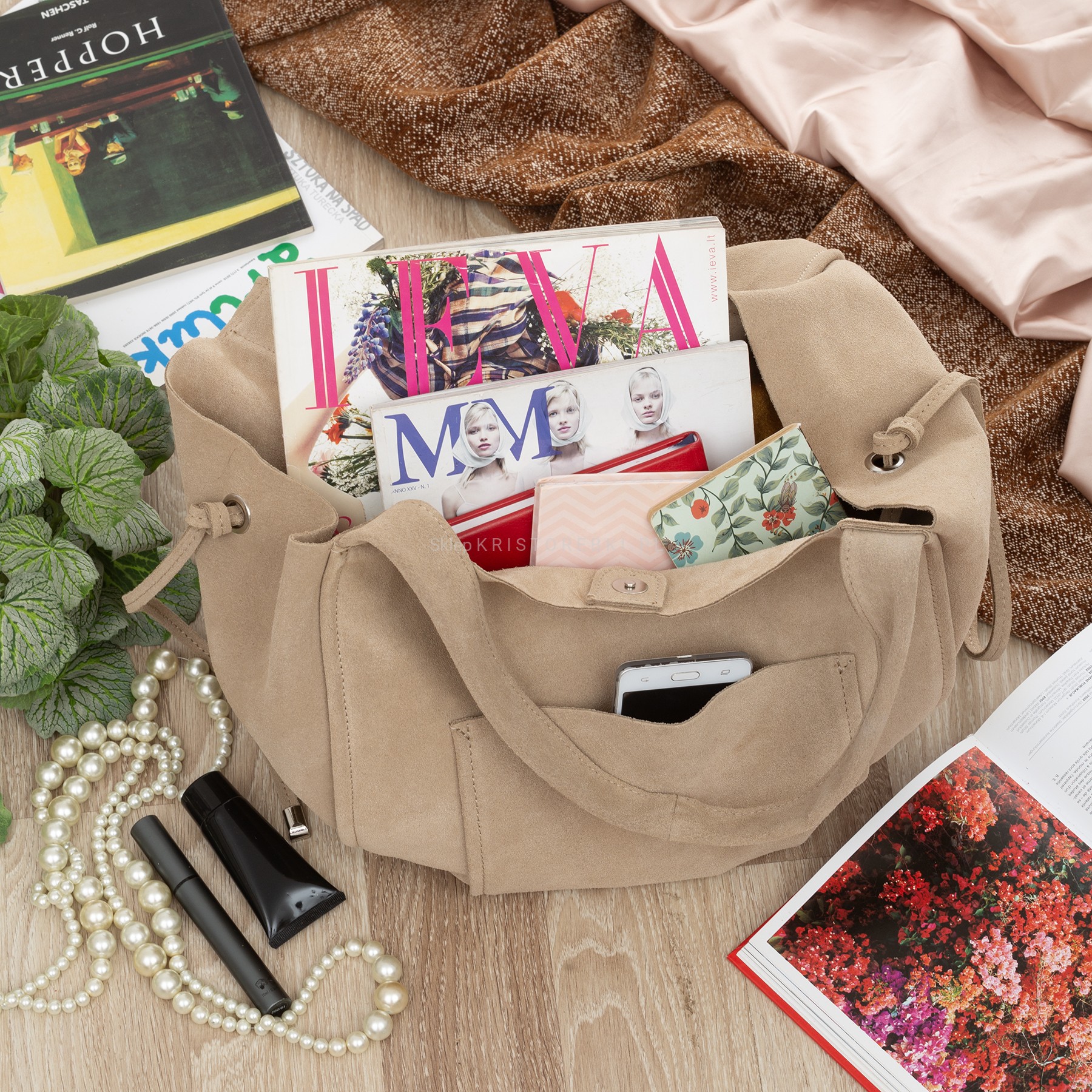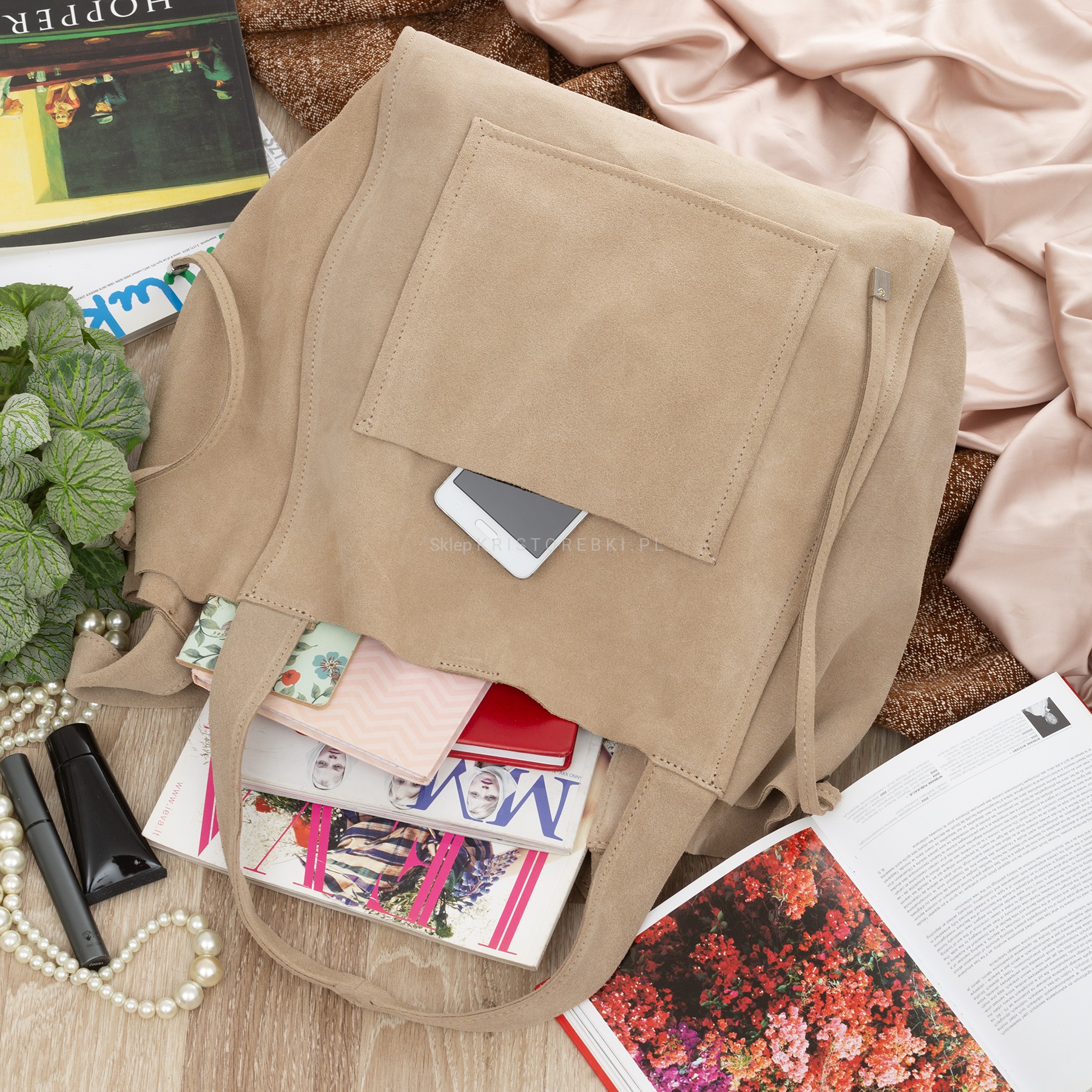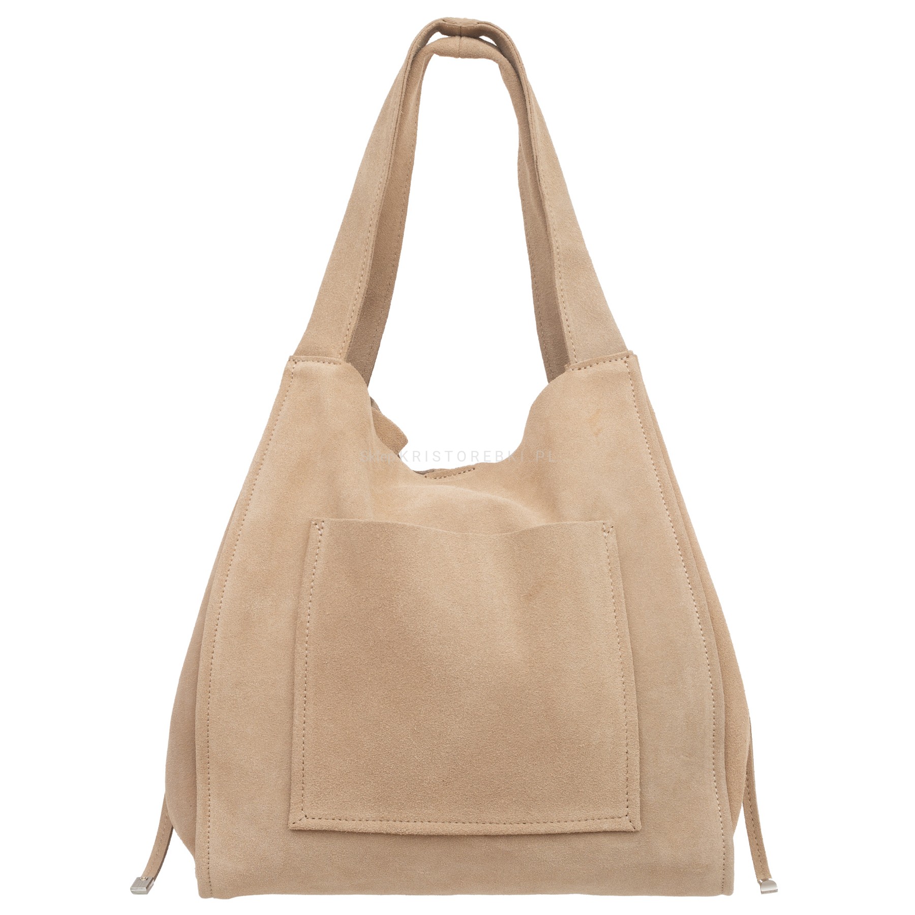 VERA PELLE torebka damska zamszowa shopper z saszetką na ramię V683 beżowa