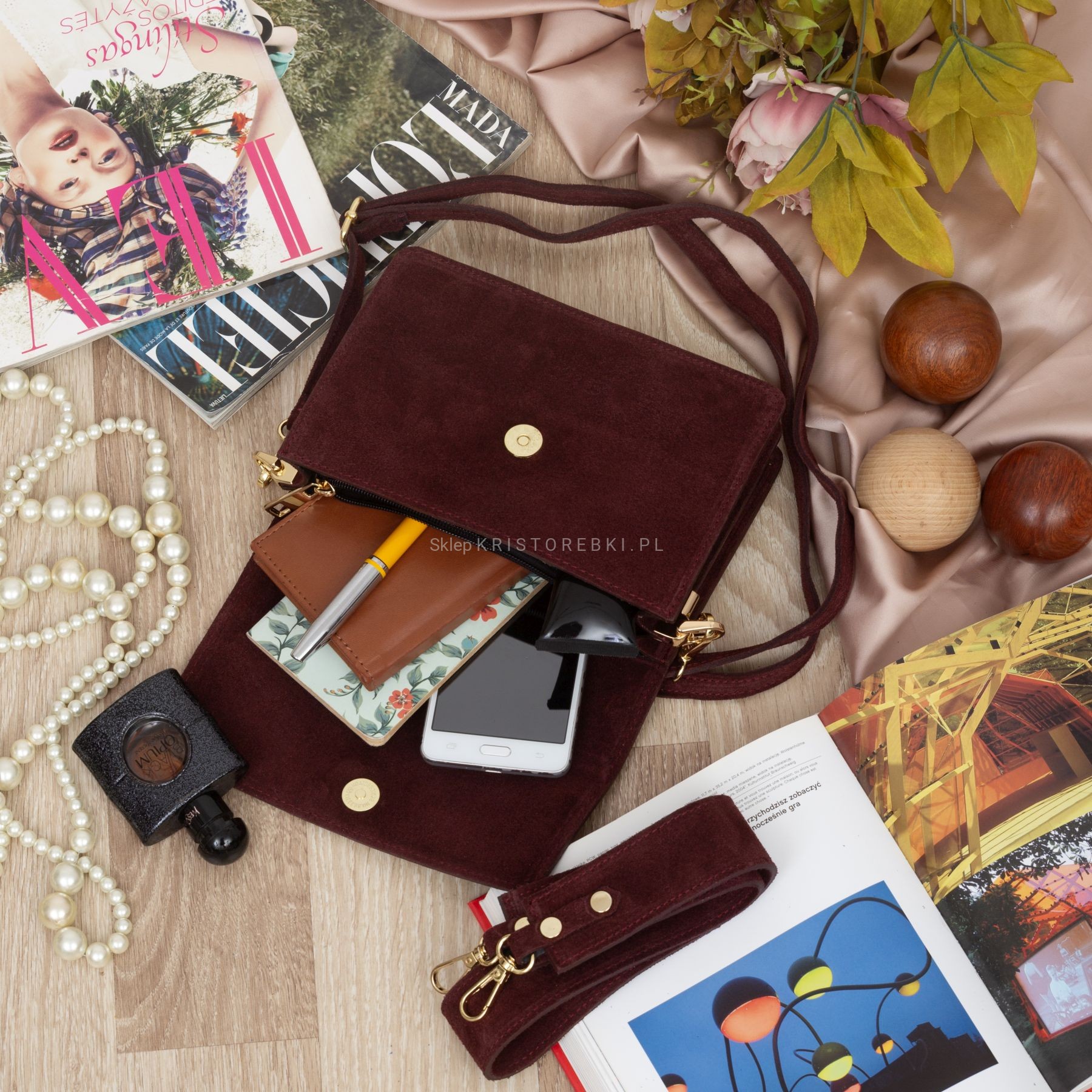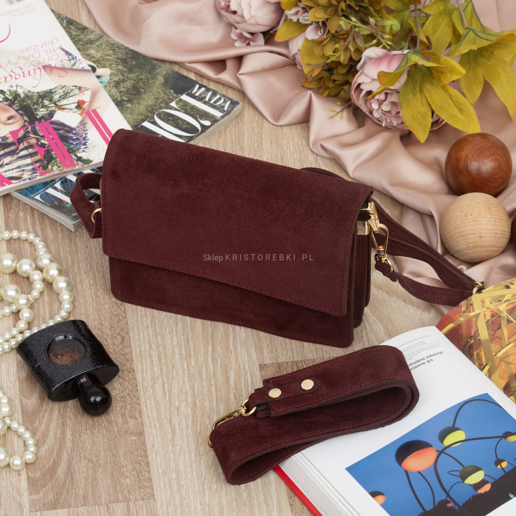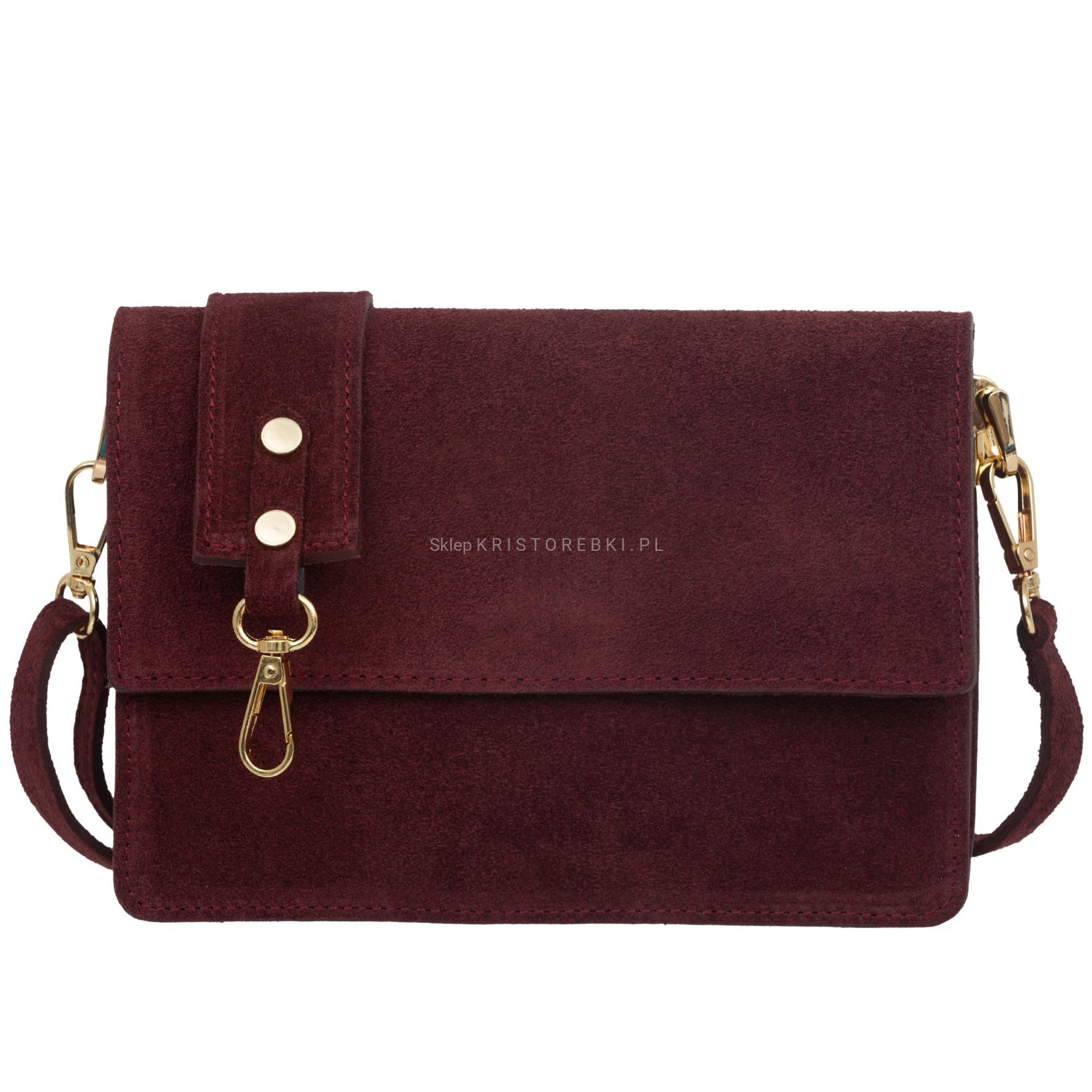 VERA PELLE torebka damska zamszowa listonoszka z klapą i szerokim paskiem V684 ciemna bordowa