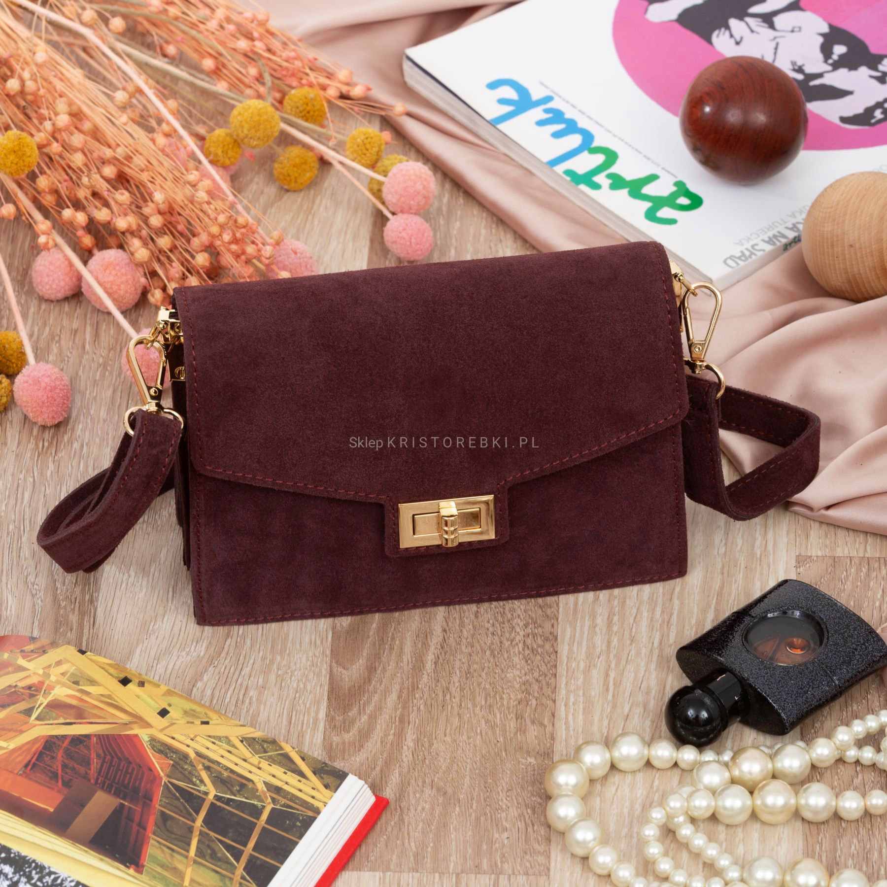 VERA PELLE torebka damska zamszowa listonoszka z klapą i paskiem na ramię V688 ciemna bordowa