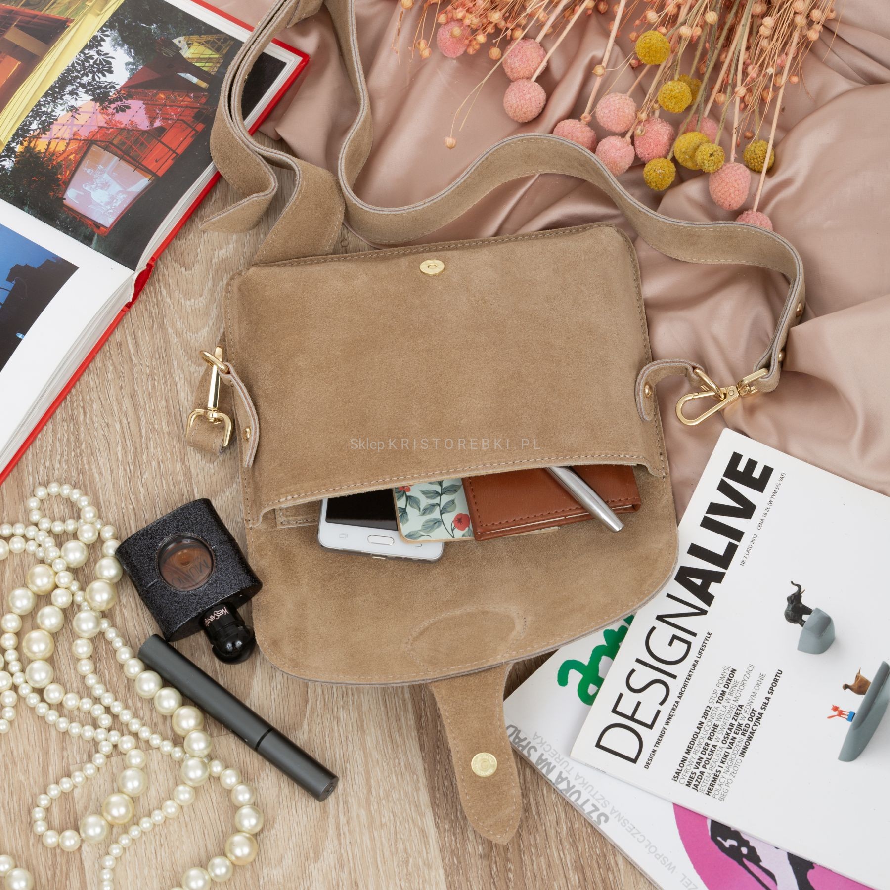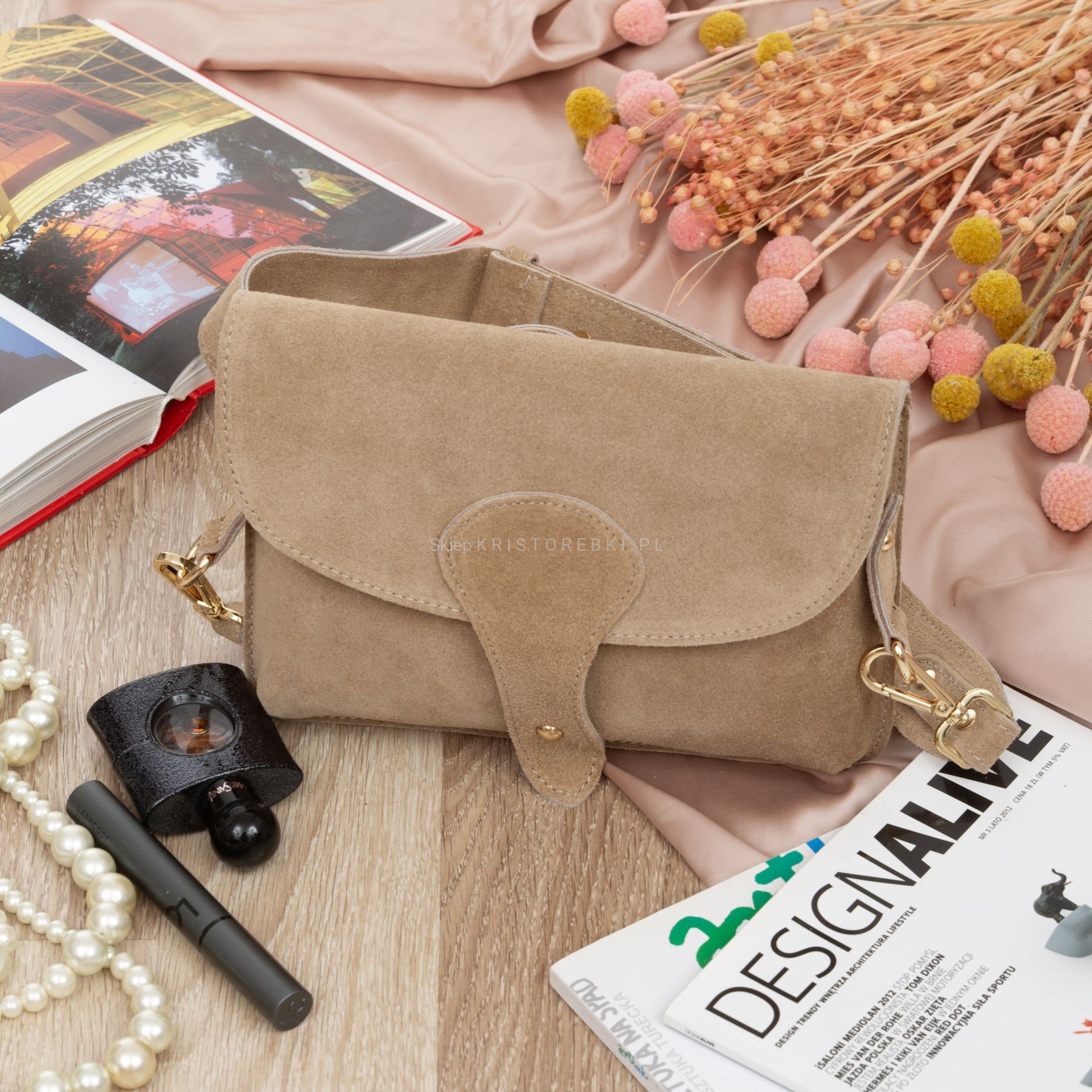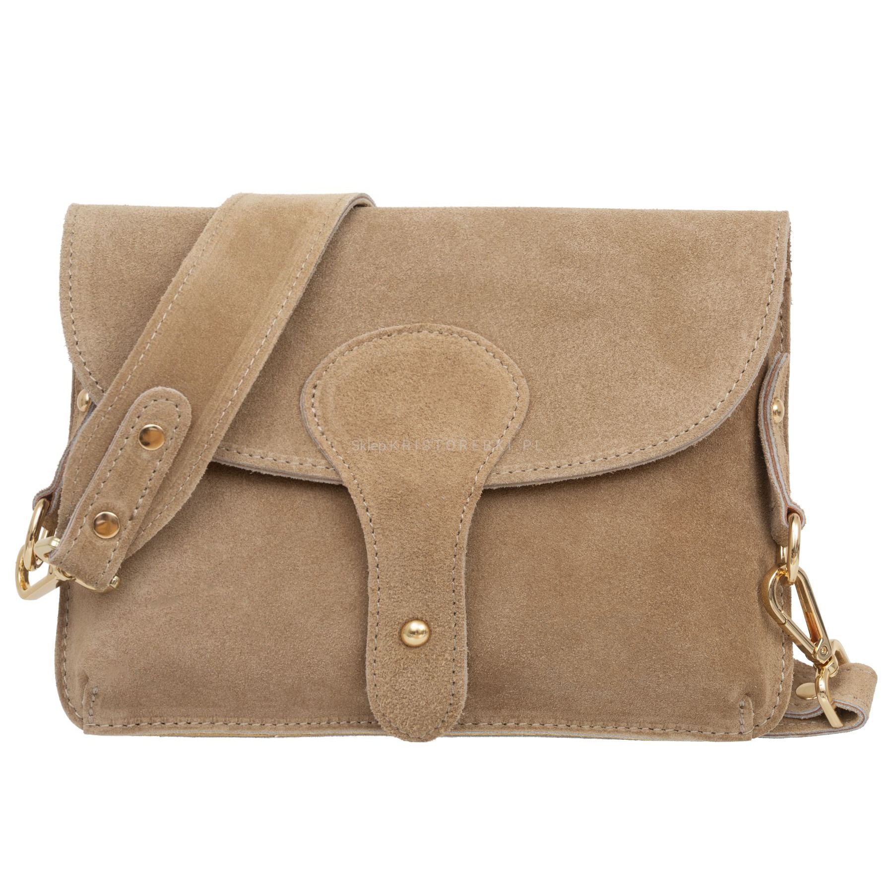 VERA PELLE torebka damska zamszowa listonoszka instagramka z szerokim paskiem na ramię V694 beżowa