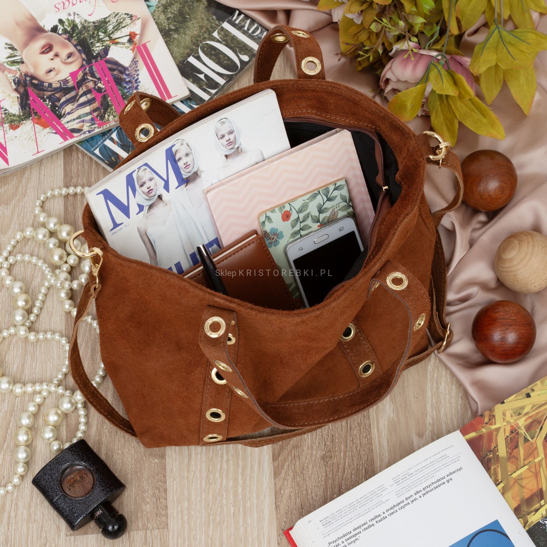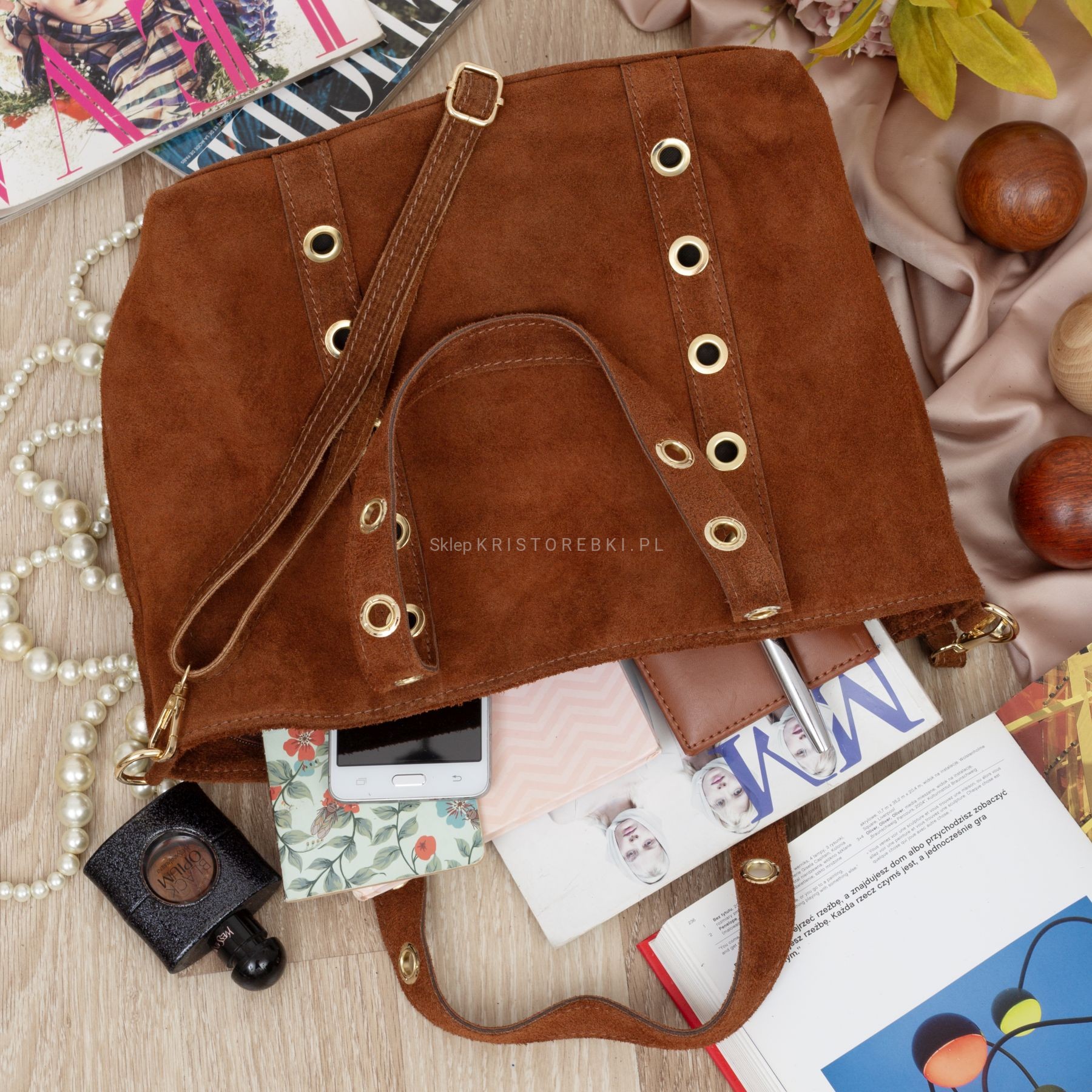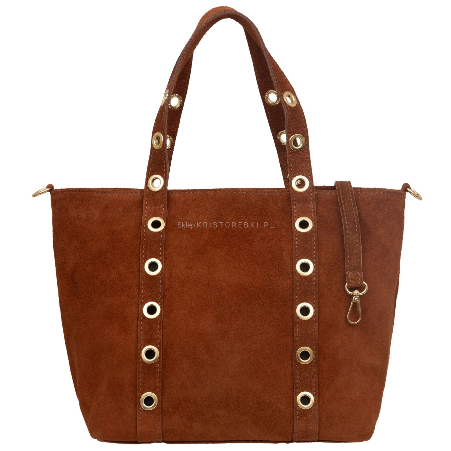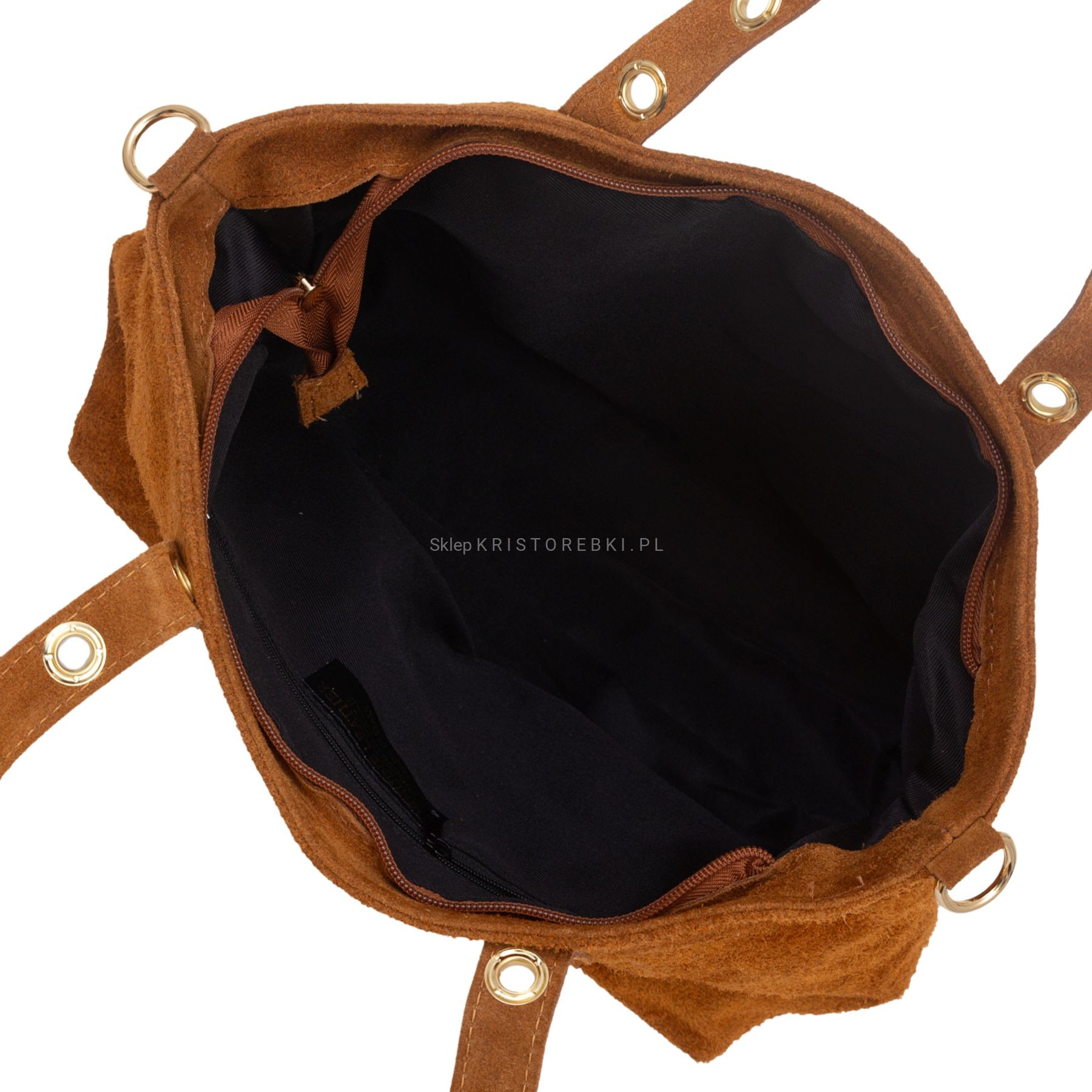 Torebka damska typu shopper znanej i cenionej na rynku europejskim marki VERA PELLE ITALY w kolorze KONIAKOWEGO BRĄZU. Uszyta została bardzo starannie z najwyższej jakości i przyjemnej w dotyku włoskiej skóry zamszowej. Torebka posiada długie rączki, dzięki czemu można ją wygodnie nosić w ręku i na ramieniu. Torebka posiada dodatkowo odpinany i regulowany pasek, dzięki czemu można ją nosić na wiele sposobów. Torebka posiada ozdobne kółka i okucia w kolorze złotym oraz zamykana jest na suwak. Jednokomorowy środek wykończony został podszewką. W środku dodatkowo znajduje się praktyczna kieszeń zamykana na suwak. Torebka jest bardzo pojemna i praktyczna w codziennym użytkowaniu.