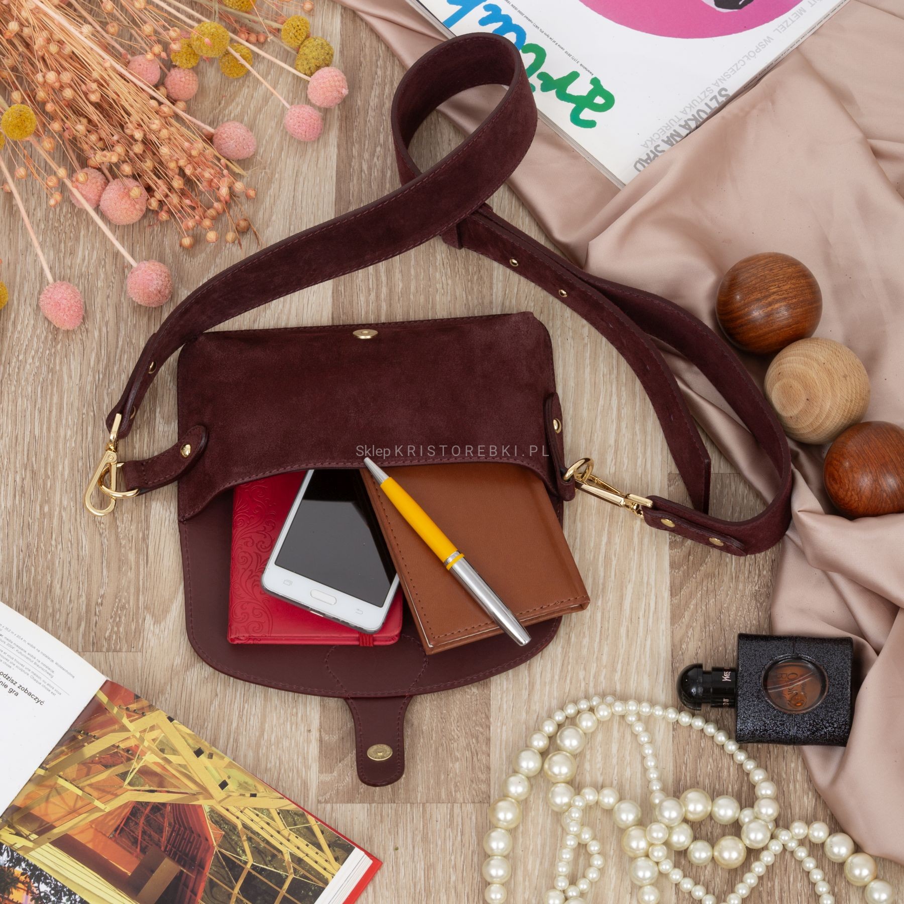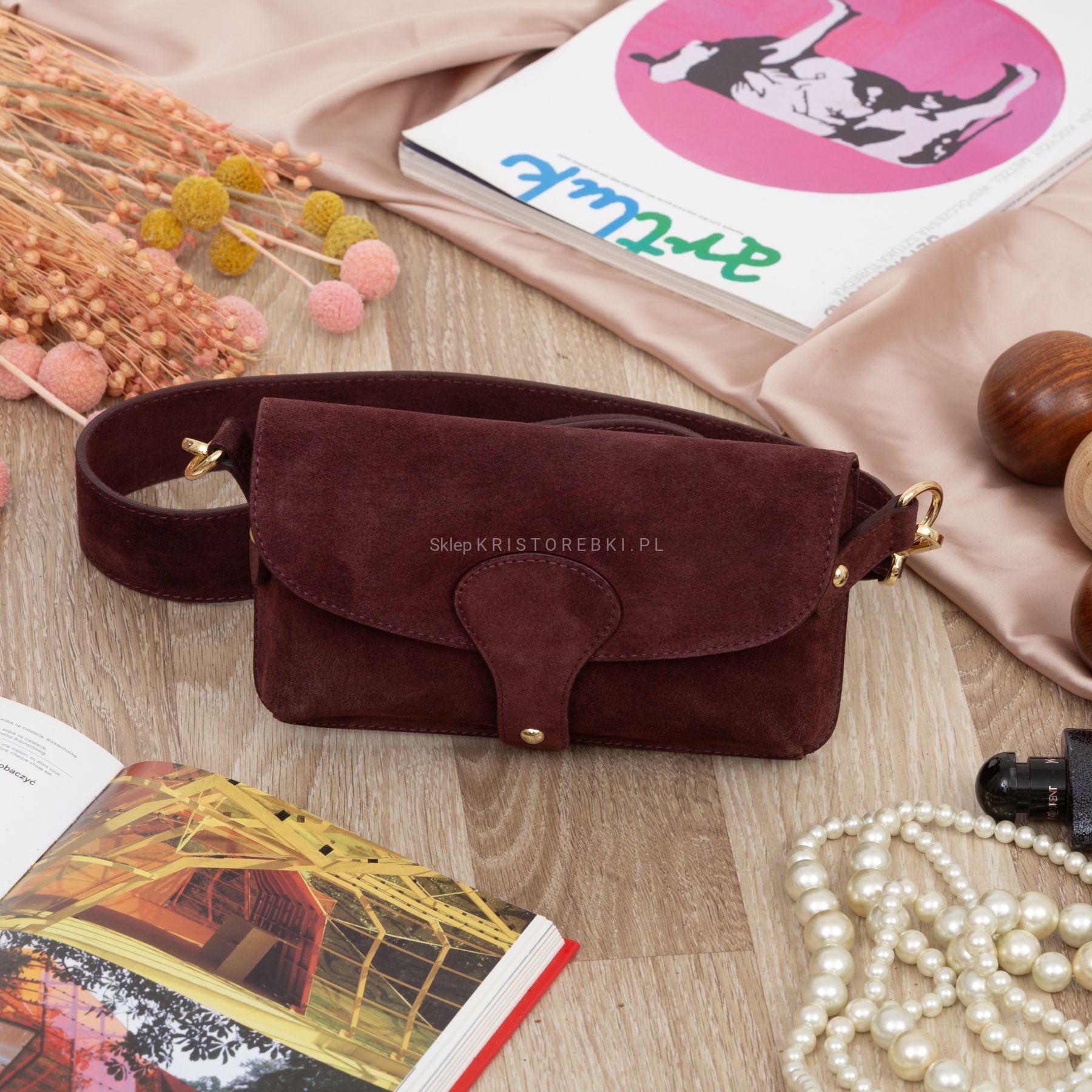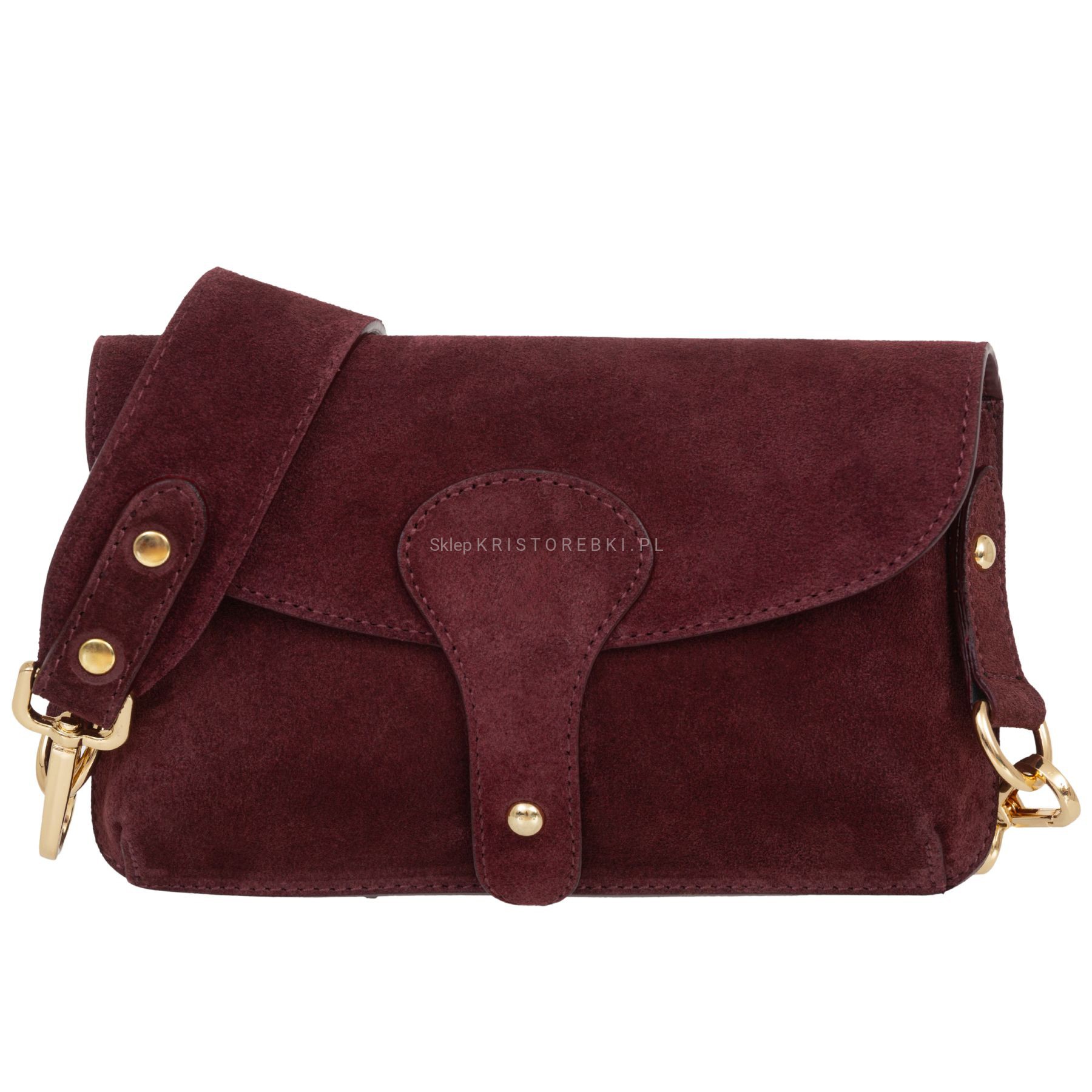 VERA PELLE torebka damska zamszowa listonoszka instagramka z szerokim paskiem na ramię V705 ciemna bordowa