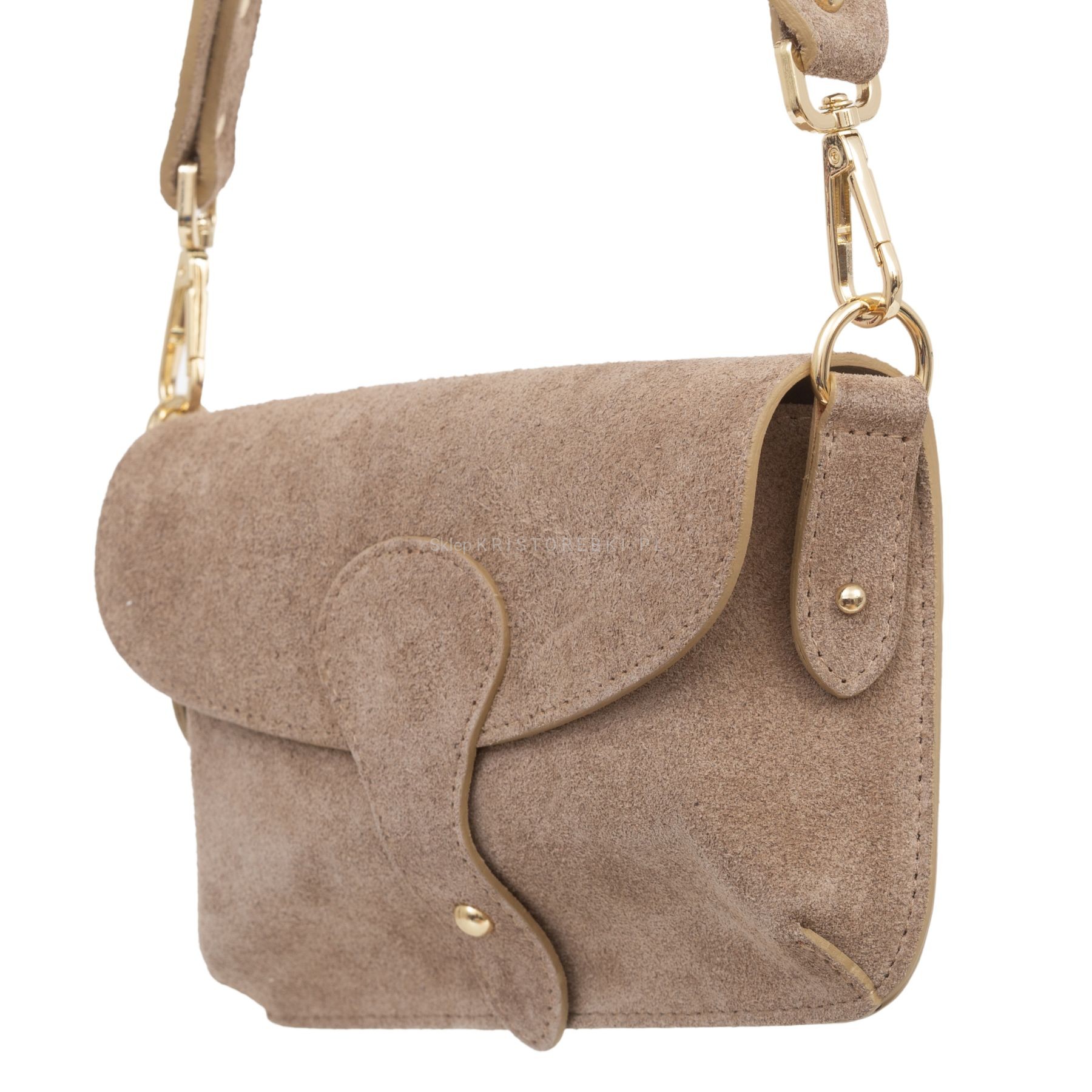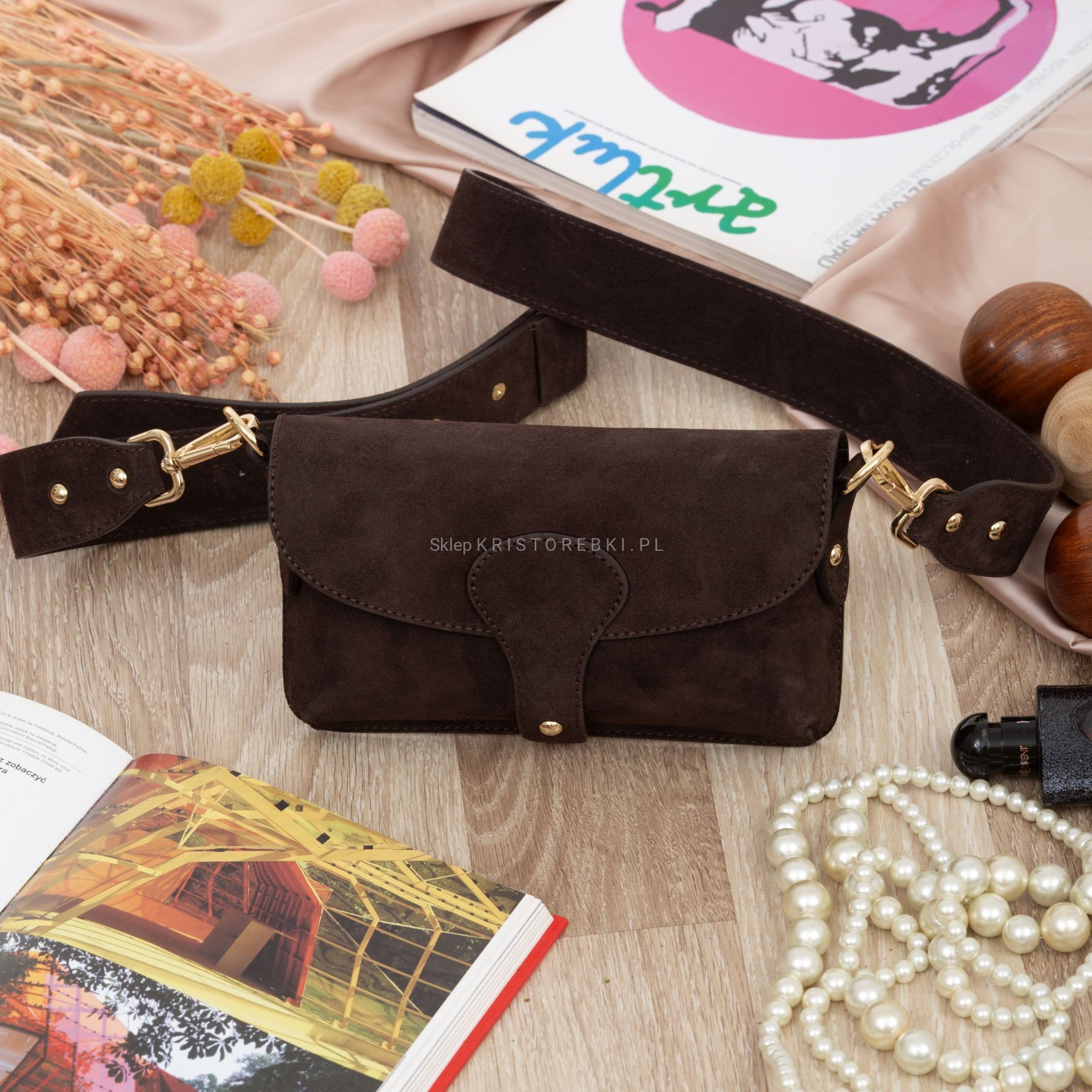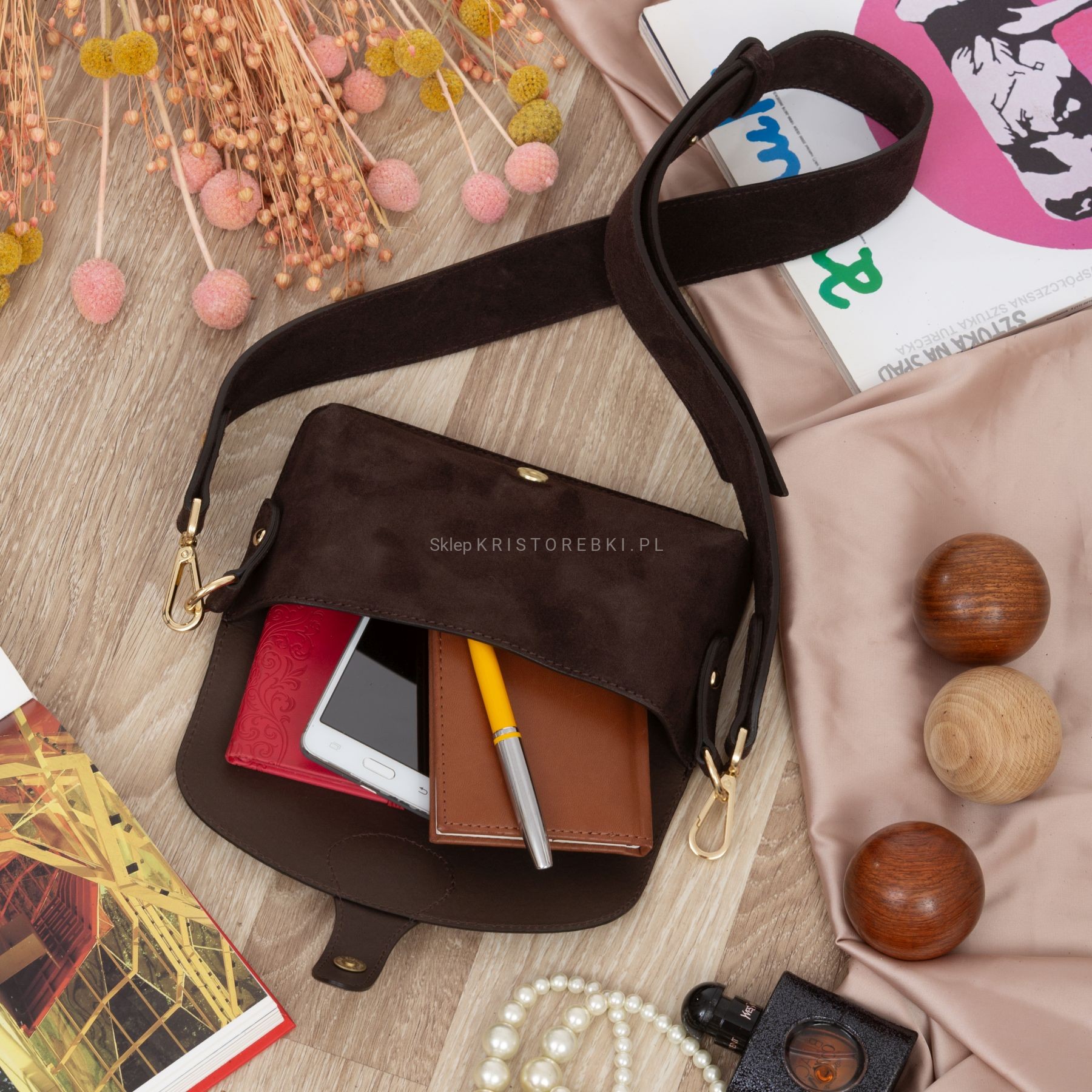 VERA PELLE torebka damska zamszowa listonoszka instagramka z szerokim paskiem na ramię V705 ciemna brązowa