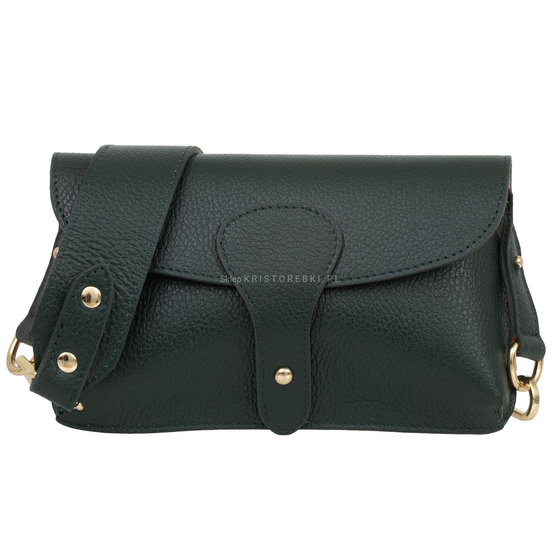 Torebka damska listonoszka instagramka znanej i cenionej na rynku europejskim marki VERA PELLE ITALY w kolorze CIEMNEJ BUTELKOWEJ ZIELENI. Uszyta została z najwyższej jakości grubej włoskiej skóry naturalnej z widoczną fakturą. Torebka posiada w zestawie długi, szeroki, regulowany i odpinany pasek do wygodnego noszenia na ramieniu. Dzięki regulacji bez trudu można ją dopasować do wzrostu i własnych preferencji. Torebka posiada złote okucia i zamykana jest na praktyczną klapę na magnes. Torebka jest bardzo wygodna i praktyczna. Będzie świetnym dodatkiem do codziennych i wyjściowych stylizacji.