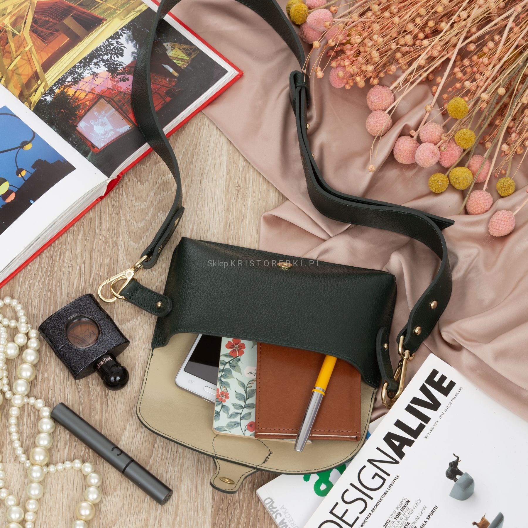 VERA PELLE torebka damska skórzana listonoszka instagramka z szerokim paskiem na ramię V725 ciemna zielona