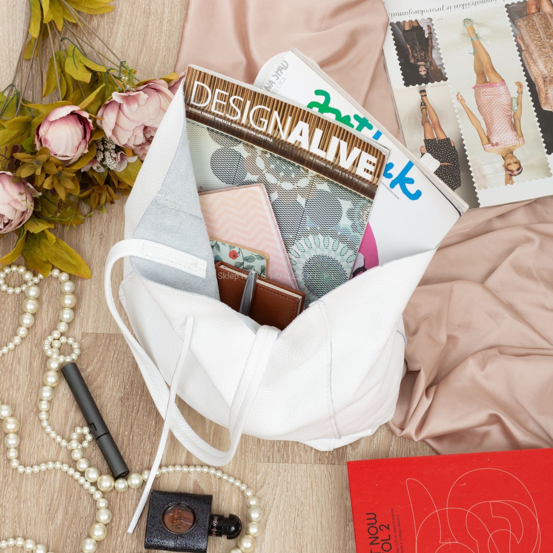 Duża torebka damska typu shopper znanej i cenionej na rynku europejskim marki VERA PELLE ITALY w kolorze BIAŁYM. Wykonana została z najwyższej jakości, grubej i pachnącej włoskiej skóry naturalnej. Torebka posiada długie uszy o wysokości 26 cm do wygodnego noszenia w ręku i na ramieniu. Torebka zapinana jest na ozdobne rzemyki. Środek jest jednokomorowy, wykończony na surowo i posiada przyczepioną na stałe saszetkę zamykaną na suwak na telefon lub dokumenty. Spód torebki jest dodatkowo usztywniony. Torebka jest bardzo praktyczna i pojemna. Będzie świetnym dodatkiem do każdej codziennej stylizacji.