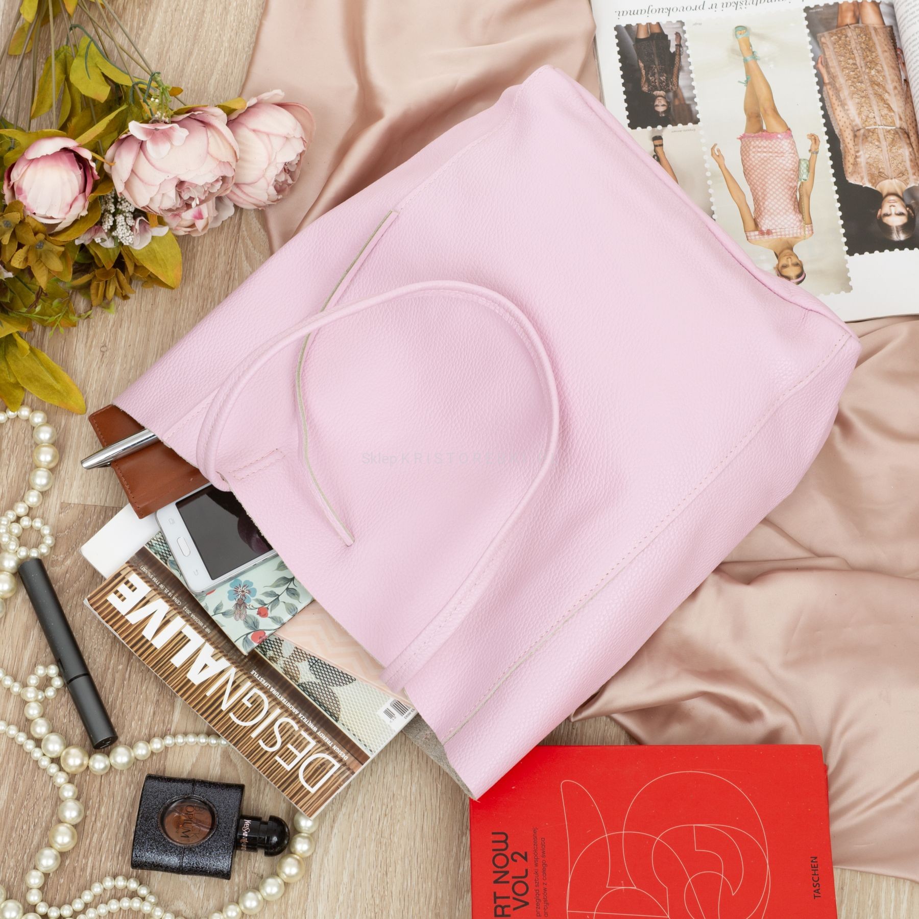 Duża torebka damska typu shopper znanej i cenionej na rynku europejskim marki VERA PELLE ITALY w kolorze CUKIERKOWEGO RÓŻU. Wykonana została z najwyższej jakości, grubej i pachnącej włoskiej skóry naturalnej. Torebka posiada długie uszy o wysokości 26 cm do wygodnego noszenia w ręku i na ramieniu. Torebka zapinana jest na ozdobne rzemyki. Środek jest jednokomorowy, wykończony na surowo i posiada przyczepioną na stałe saszetkę zamykaną na suwak na telefon lub dokumenty. Spód torebki jest dodatkowo usztywniony. Torebka jest bardzo praktyczna i pojemna. Będzie świetnym dodatkiem do każdej codziennej stylizacji.